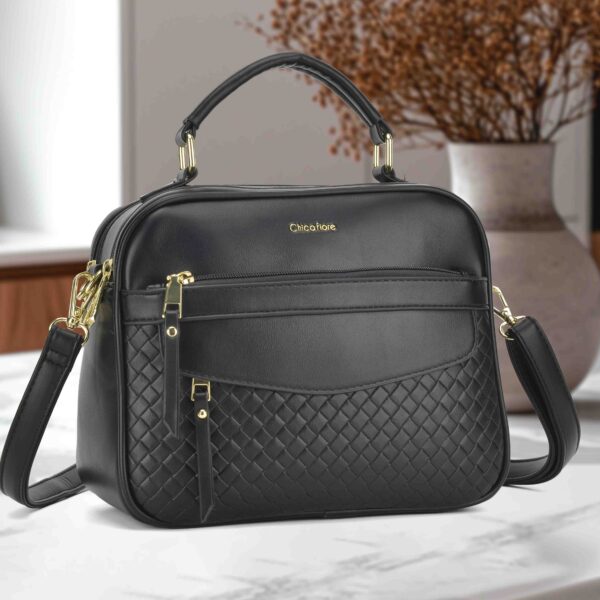 O modelo CH-3539 foi pensado para oferecer máxima praticidade. A bolsa conta com múltiplos compartimentos, incluindo um bolso frontal com zíper de fácil acesso, ideal para itens essenciais como celular e chaves. O puxador do zíper frontal possui um detalhe alongado elegante. A bolsa oferece versatilidade com sua alça de mão reforçada e alça longa ajustável e removível para uso transversal ou a tiracolo. Os metais dourados conferem um acabamento premium e durável.