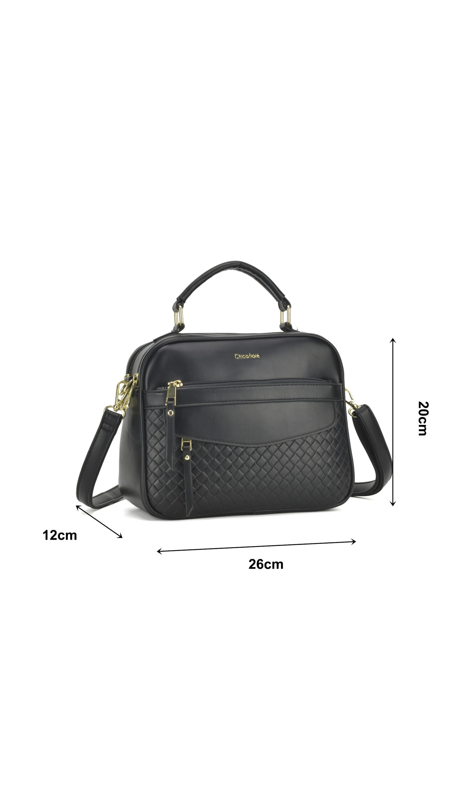 Com dimensões ideais de 26 cm de comprimento, 20 cm de altura e 12 cm de profundidade, esta bolsa feminina transversal com textura oferece um visual estruturado que mantém sua forma impecável. O grande diferencial do modelo é o acabamento frontal com textura matelassê em padrão trançado, que adiciona um toque de luxo e exclusividade à peça. A inscrição “Chicafiore” delicadamente gravada em dourado complementa o design com sofisticação.