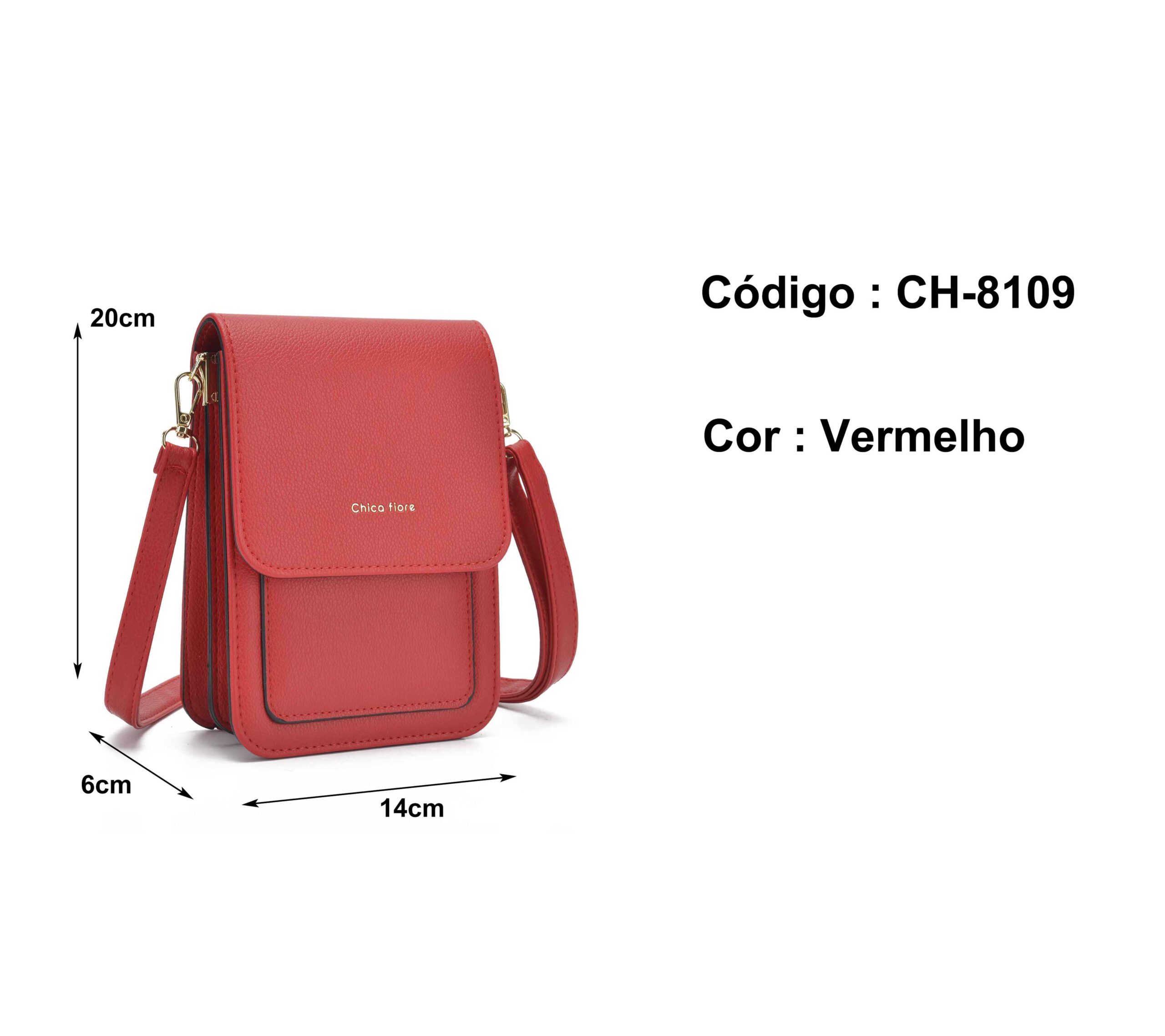Procurando uma bolsa feminina transversal porta celular prática e elegante? Conheça o modelo CH-8109 da Lumoza. Compacta (14x20x6cm), na cor vermelha. Compre já!